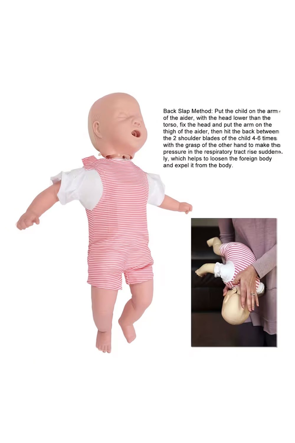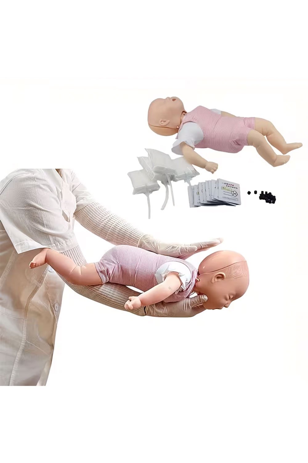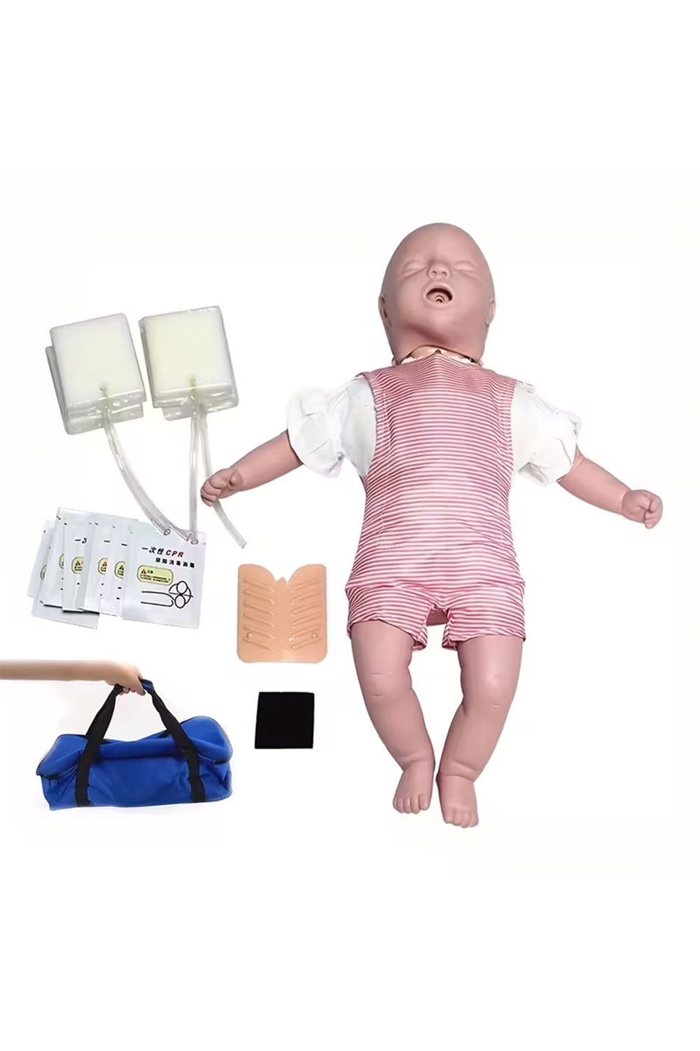 دمية تدريب على الإنعاش القلبي الرئوي للأطفال، تتضمن نموذجًا لانسداد مجرى الهواء، وأدوات تدريب على الإنعاش القلبي الرئوي والإسعافات الأولية، وأربع أكياس لانسداد مجرى الهواء، وعشرة أقنعة واقية، ومجموعة كاملة لانسداد مجرى الهواء بجسم غريب، ونموذج تدريب لكامل الجسم.
